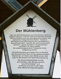 Tafeltext: Hier auf dem Mühlenberg von Kirchmöser befand sich von 1738 bis 1931 eine Bockwindmühle. 1834 errichtete man auf dem Berg eine Station der optischen Telegrafenlinie Berlin-Koblenz. Die Nachrichtenübertragung mit verstellbarem Signalflügelwerk - damals als Jahrhundertwerk gefeiert - geriet schnell in Vergessenheit nachdem 19 Jahre später die elektromagnetische Telegrafie ihren Siegeszug antrat.